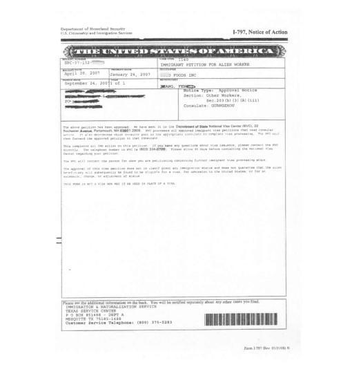 美国移民局批准文件